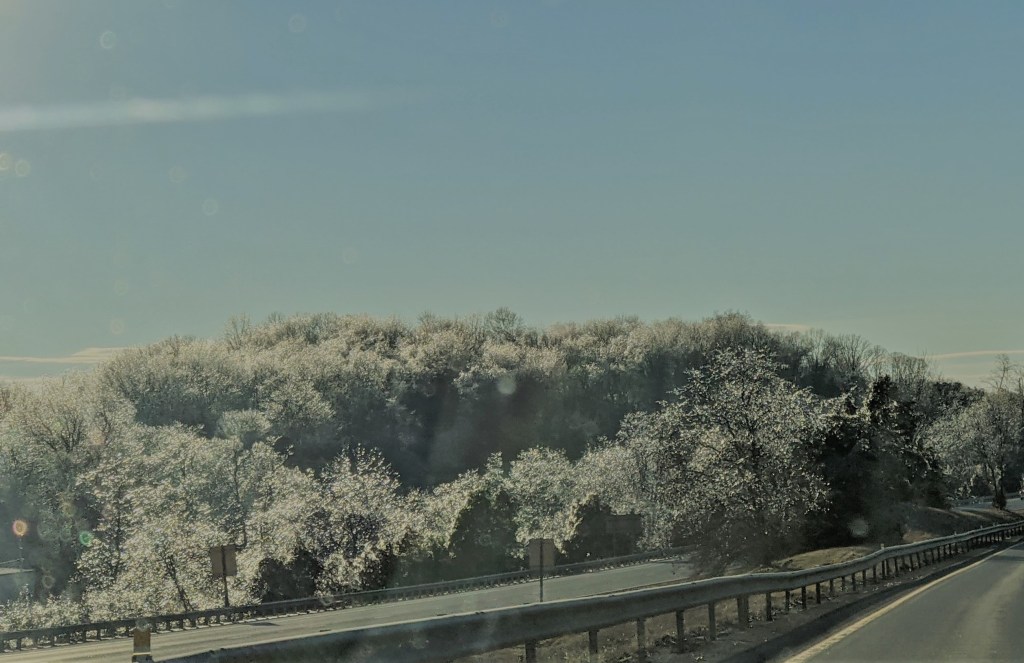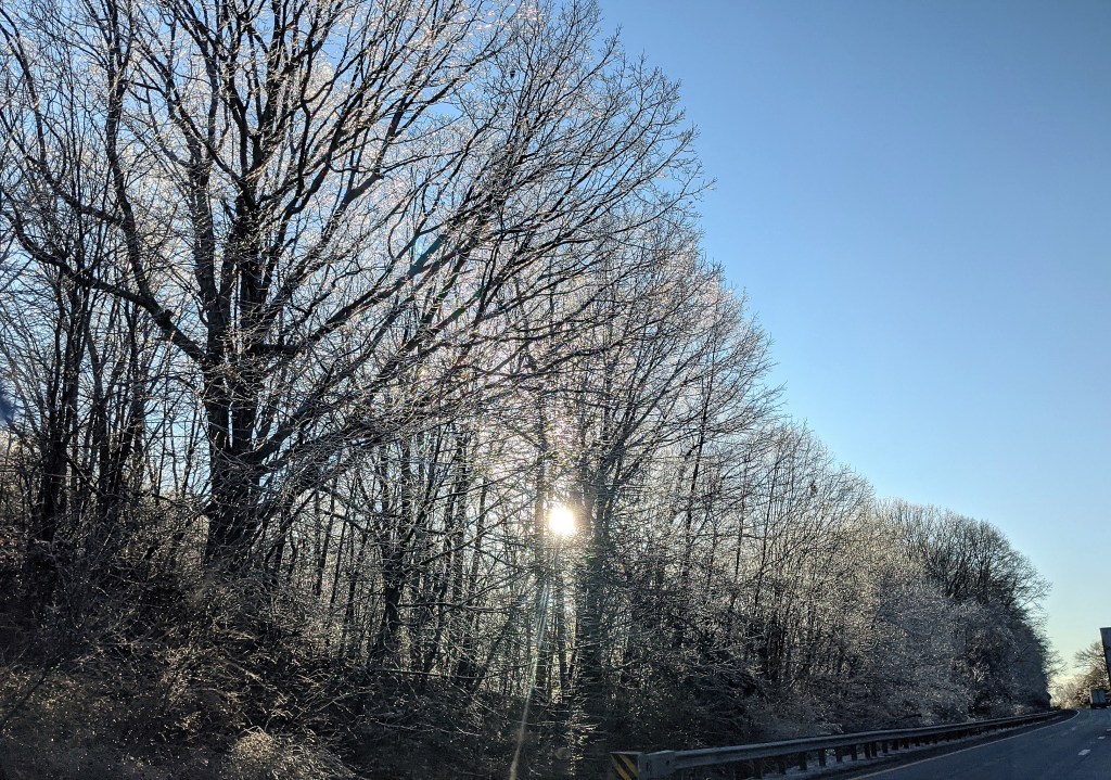 I recently had reason for travel that included a stretch of Interstate 81 across the state of Virginia. Snow had fallen as part of the huge storm that affected 2/3 of the country, but snow wasn’t the issue by the time of my travel—the frigid temperatures and the arctic winds were. Yet even with that discomfort, which can certainly remind us of who is in charge, I was blessed with a most wondrous display of exquisite beauty: iced trees. As my husband and I rounded a corner, before us lay a display that only cliches can really describe—a “fairy world,” a “winter wonderland,” ice that “sparkled like diamonds.” The western afternoon sun reflected off of millions and millions of ice crystals that bejeweled the trees against a vivid blue sky. Trying to take pictures with a phone camera in a vehicle moving at 70 mph does not good photography make, but perhaps offers just a glimpse into the miracle with which we were gifted, mile after mile. We were spellbound.