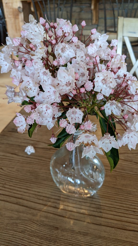 Writing is difficult. At times, I wonder why I bother. Other times, I tend to become frustrated and want to give up when I encounter a subject that eludes my art medium: words. Take, for instance, mountain laurel. Where I live, in the southeastern United States, the shrub is in full glory. It tends to grow in the most difficult places—on arid, rocky shorelines or tangled up in dense forests. Every single part of it is toxic. And yet, and yet, its blossoms enchant me, and I want to share that enchantment . . . but words don’t suffice . . . and I’m a writer and poet and so what do I do? It’s difficult.