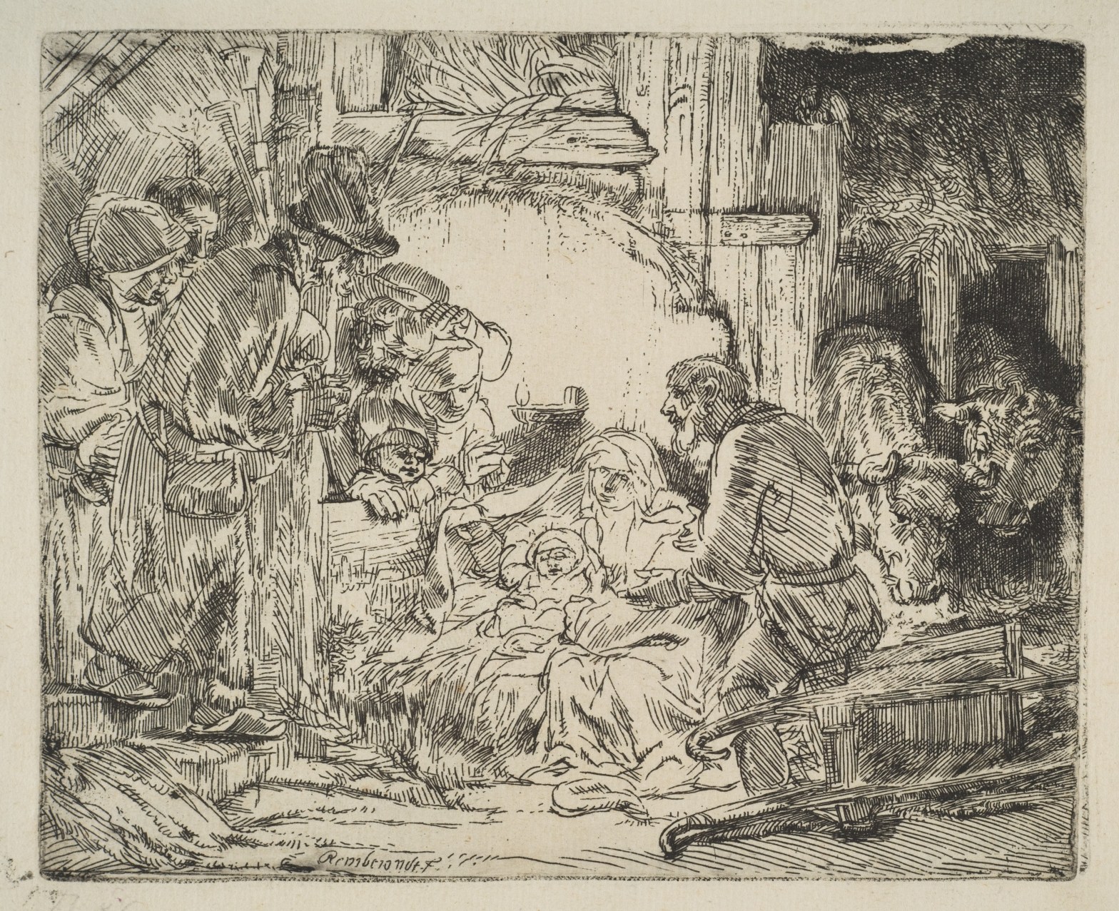 In the now, I am reflecting on this 1600’s woodprint created by Rembrandt van Rijn and entitled The Adoration of the Shepherds: With the Lamp. As I sit with this image, I notice how well van Rijn played with dark and light, the backs of the characters in shadows but their fronts aglow. I see the small oil lamp, the tiny flame in this scene that sheds so much light that mother and child are awash in it. But interestingly, what catches my eye more than anything else isn’t the baby in Mary’s lap, but that other child, the little boy with a cap on his head, standing encircled by his father’s (?) arms.