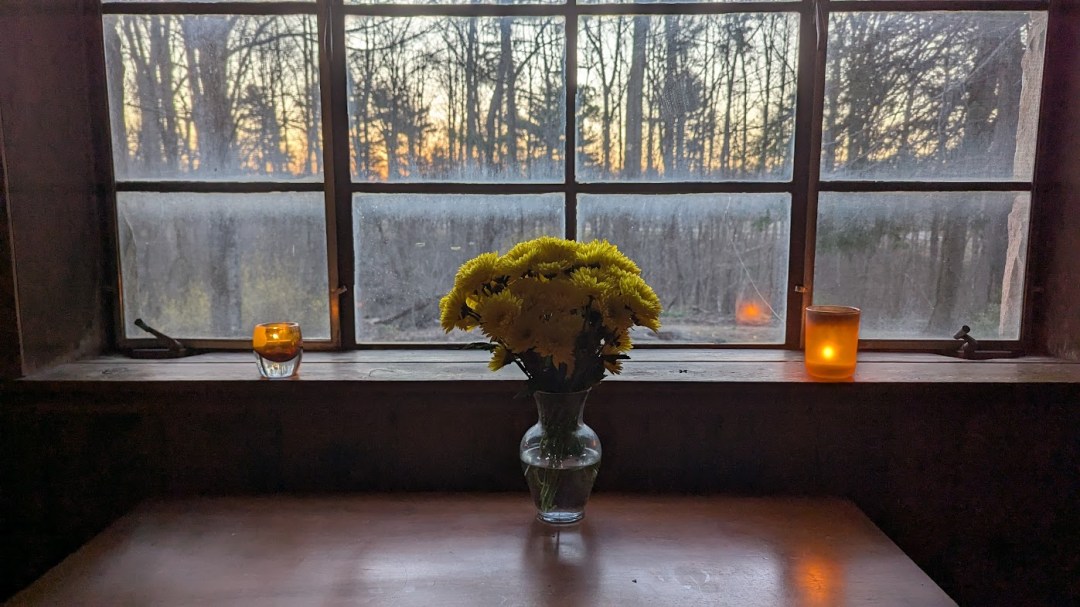 two unmatched candles on the sill,
