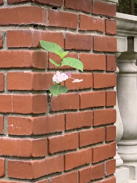 During this chaotic and uncertain time in world and U.S. history, this blog highlights works of art as a means of resistance and resilience. You may find recent contributions here under “Writings”: https://spirit-reflections.org/. Today, I offer the above photograph taken by gardener Teresa Culbert. She captioned the photo, “Bloom where you are ‘accidentally’ planted. Second year it has survived and bloomed in the brick column of the terrace.”